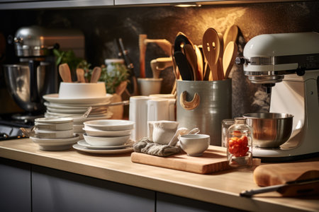 Organized Kitchen Counter: A Collection of Pristine Appliances and Spotless Utensils