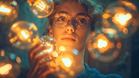 Young woman gazing at glowing light bulbs in a dark setting, evoking a sense of creativity, inspiration, and innovation in an artistic environment.