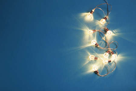 christmas electric garland on blue paper background