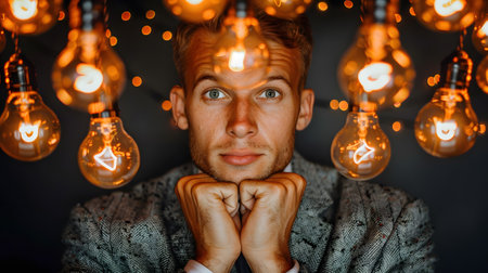 A man in a suit is standing in front of a bunch of light bulbs at a fun event