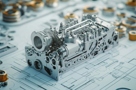 Intricate mechanical components on blueprint showcasing engineering excellence and innovation