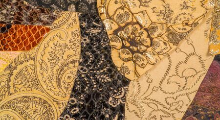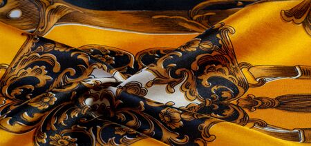Silk sepia color with floral print and rhombuses. Soft fabric, glossy texture background, satin background, fabric luxury work, elegant pattern, colorful abstract, colorful velvet, macro shredded.