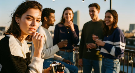 A young woman stands alone on a rooftop with friends in the background
