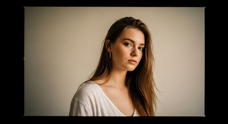 A young woman with long brown hair and a white V-neck top looks directly at the camera with a neutral expression against a plain beige background.