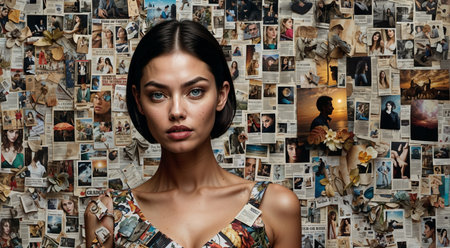 Rear view of woman in front of a wall full of photos making a choice. Background, AI-generated