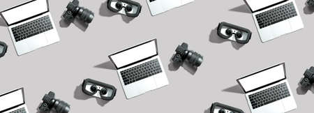 Tech gear theme with vr headset, dslr camera and laptop