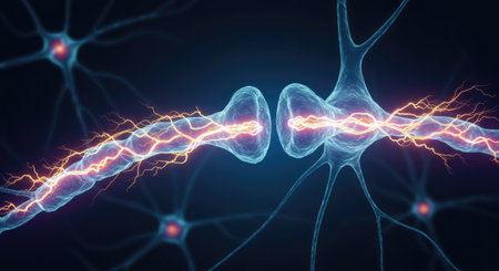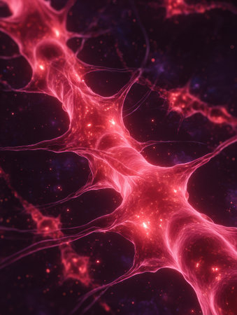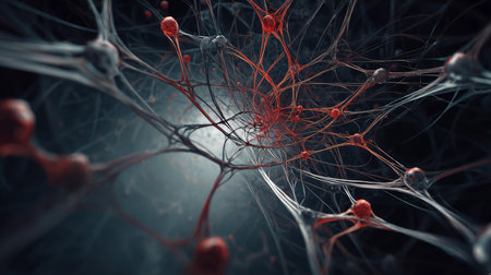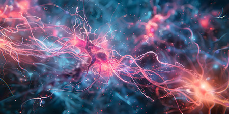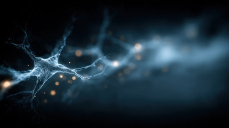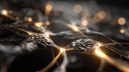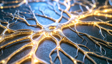 Intricate neural connections are depicted against a dark background showing glowing elements and fine textures.
