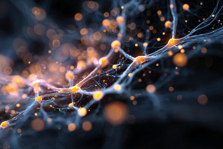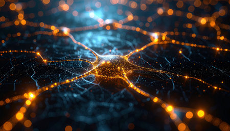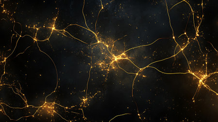 This image presents an abstract view of neurons, depicted with glowing lines and points against a dark background. The composition highlights interconnected structures, showcasing vibrant orange and yellow hues. The artwork's style suggests a focus on digital art, suitable for various science or technology-related applications and editorial purposes.