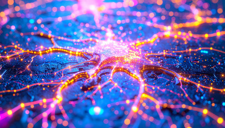 Neural network connections shown with bright colors and glowing synapses in a futuristic artistic style