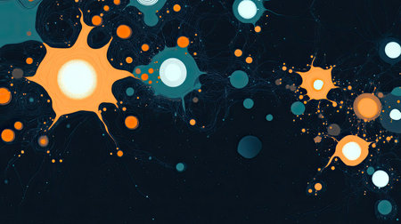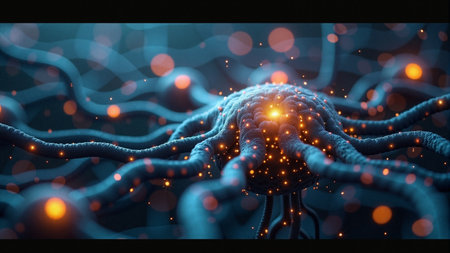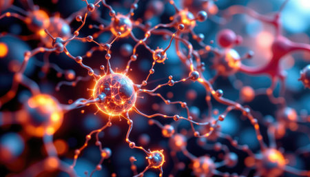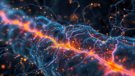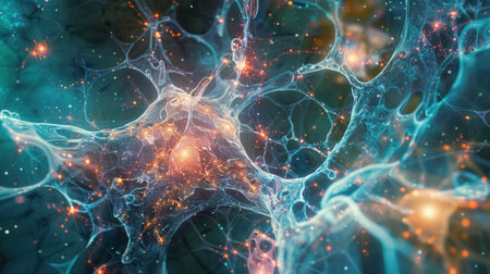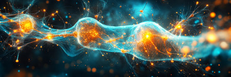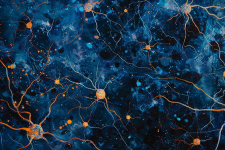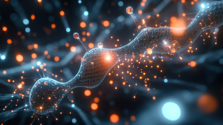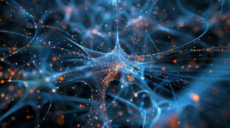 An artistic depiction presents a network of interconnected nodes and lines, resembling a complex biological structure. The composition utilizes a dark background to highlight glowing orbs and pathways in shades of blue and orange. This visualization is suitable for applications in science, technology, and design.
