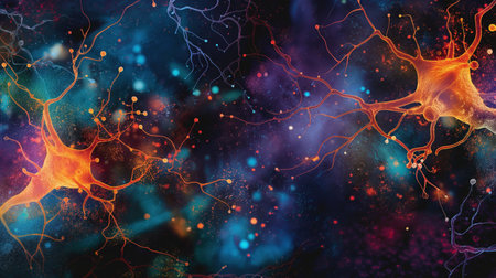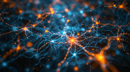This mesmerizing image features an intricate network of neurons and synapses, illuminated by vibrant orange and blue hues, encapsulating the beauty of biological connections.