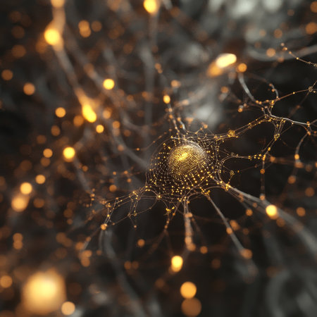 An abstract digital composition depicts interconnected networks with luminous lines and bokeh effects. The design showcases a dark background with golden and bright highlights, creating a sense of depth and movement. This visual could be suitable for scientific, technological, or conceptual projects requiring a futuristic aesthetic.