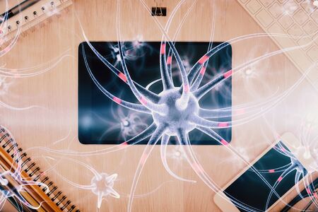 Double exposure of neuron drawing over table with phone. Top view. Science education concept.