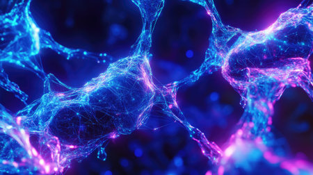 An abstract visualization of a neural network with glowing blue and purple interconnected nodes and light trails...