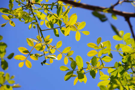 Acacia leaves on the blue sky background in summer sunshine. Selective focus on luscious green acacia leaves against a blue cloudless sky.