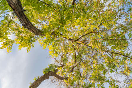 Golden shower tree with yellow blossoms on branch. Cassia fistula in bloom on springtime on selective focus
