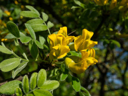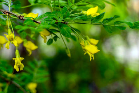 Close-up shot of yellow flowers of Siberian peatree (pea tree) (Caragana fruticosa) deciduous shrub in a sunlight in park