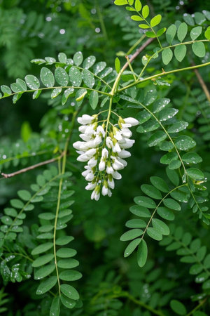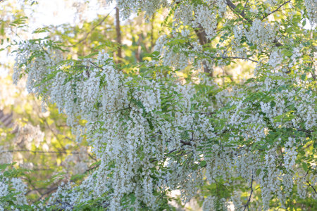 Robinia pseudoacacia ornamental tree in bloom, bright white flowering bunch of flowers, green leaves on branches
