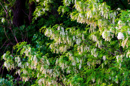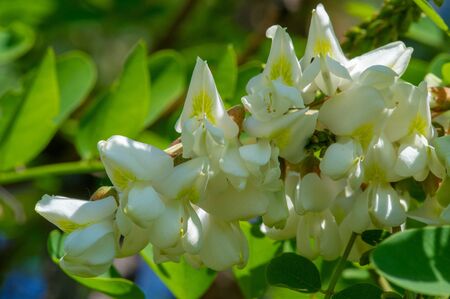 Beautiful white flowers of white acacia Robinia pseudoacacia, a flowering acacia tree with flowers in form of inflorescences.