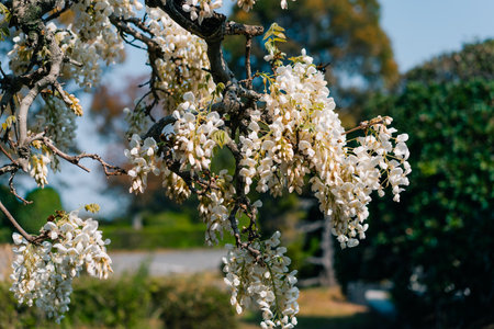 Blooming flowers of white acacia tree in a park at spring.