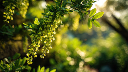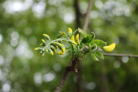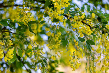 Unfocused, natural background with bokeh and blossoming yellow locust in the forest. selective focus