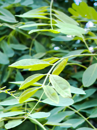 Lush green compound leaves on a black locust tree branch creating a vibrant natural pattern and symbolizing growth, freshness, and environmental beauty in outdoor light
