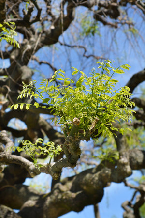 Weeping Japanese pagoda tree branches with new leaves - Latin name - Sophora japonica Pendula