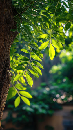 The Indian rosewood in spring, fresh green leaves, soft sunlight filtering, vibrant atmosphere full of vitality, natural textures, serene mood P.