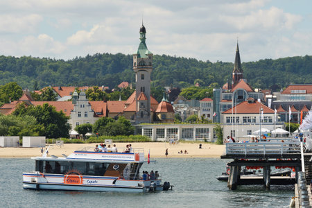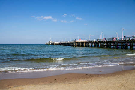 Sopot, July 14: cruise vessel at on the longest wooden pier in Europe on July 14, 2020 at Sopot, Poland. Sopot is a seaside resort city in Eastern Pomerania