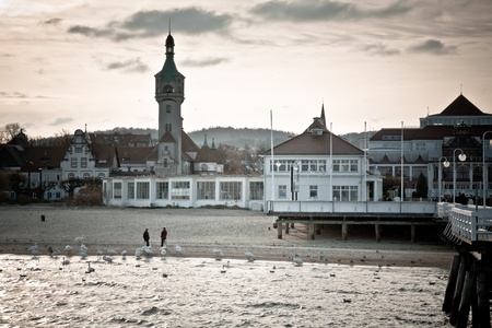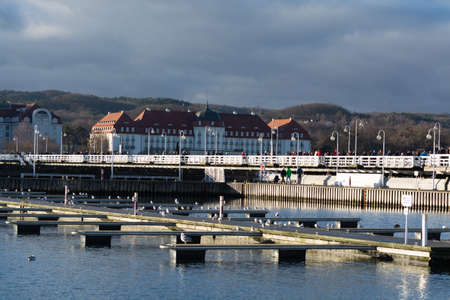 Sopot, Poland - Feb 16, 2019: View at the historical buildings at the entrance to pier called molo in tourist resort town of Sopot, Poland.