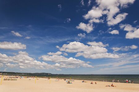 Beach and port in Kolobrzeg, Poland. People on the beach
