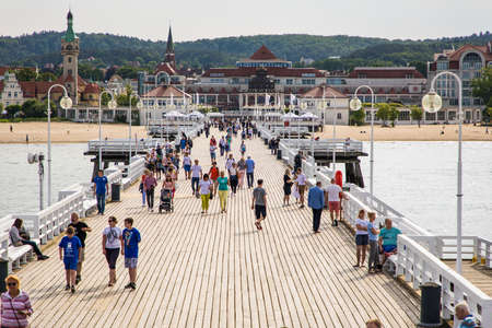 SOPOT, POLAND - 9 AUGUST: People on Sopot molo at Baltic Sea, 9 august 2014. Sopot is major health and tourist resort destination and this pier with 511.5 meters long is the longest wooden pier in Europe.