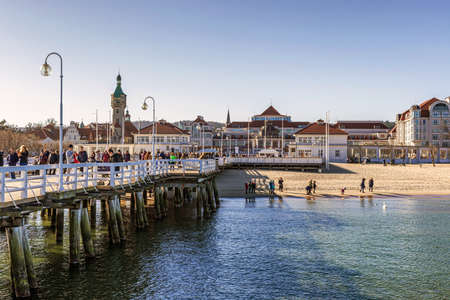 Sopot, Poland - Feb 16, 2019: People walking on the pier at Baltic sea in the tourist town of Sopot in Poland