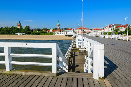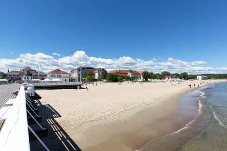 Sopot, Poland - June 6, 2018: Wooden Sopot pier in sunny day, view of the Grand Hotel and sandy beach