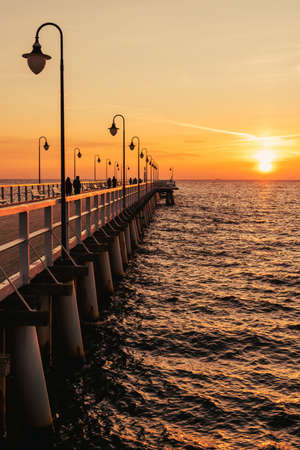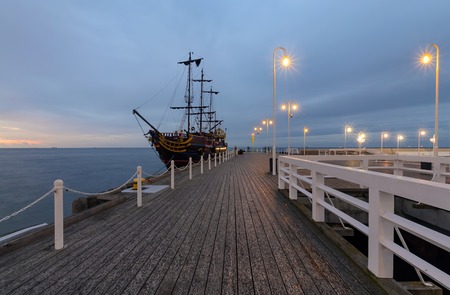 Pier and ships in Sopot at sunset, Poland. Europe.