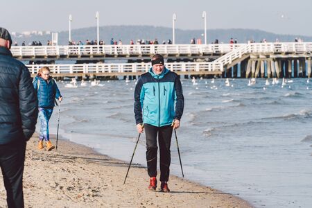 Poland, Sopot, February 9, 2020. People jogging on cold beach. Nordic walking. Winter season at seaside. Winter Walk on Beach. People chill out in cold season on coast. crowd walking on beach in Sopot