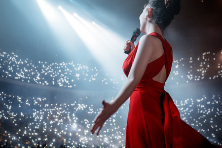 A singer passionately performing on stage with a microphone in front of bokeh-style lanterns, bathed in bright light and surrounded by a lively atmosphere.