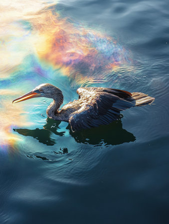 Seabird fights to stay afloat on ocean surface contaminated by an oil spill, reflecting a rainbow sheen under the sunlight.