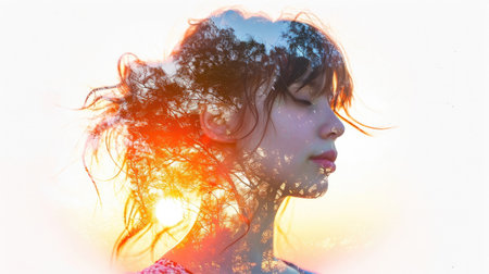 The closeup double exposure picture between young adult beautiful female caucasian human and bright beautiful nature in the morning or evening that the picture stand for peaceful of the life. AIGX01.