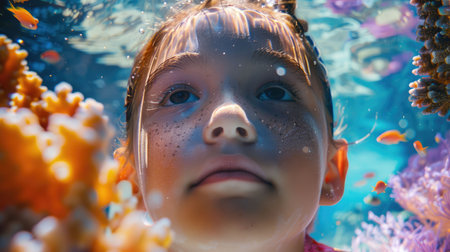 A young girl with diving equipment and a mask is exploring the underwater environment, swimming in the ocean to observe marine organisms and practice underwater diving AIG50