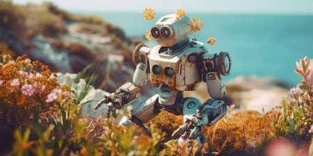 A toy robot is standing on a hill near the ocean. Generative AI image.