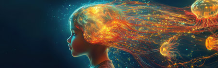 A child's side profile emanates tranquility, surrounded by glowing jellyfish. The vibrant colors and ethereal light create a magical underwater ambiance, evoking feelings of wonder and inspiration.