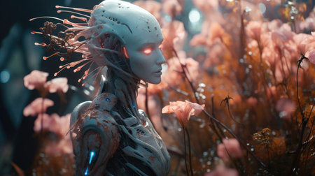 Beautiful face of biological robot with wires implanted. Biological innovations, futuristic technologies are changing attitude to AI