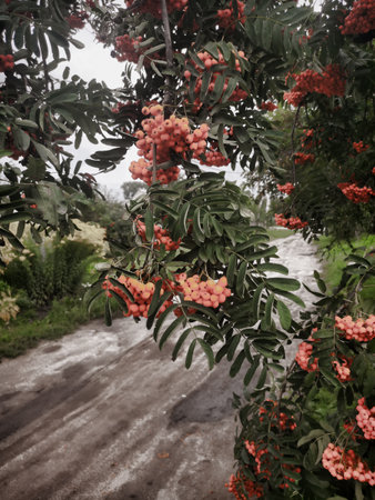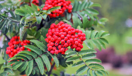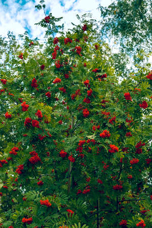 Rowan tree with ripe red berries on the branches grows in the city park.