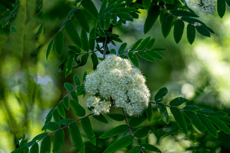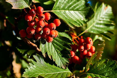 The Rowan berry in summer, Bright sunlight pierces dense foliage, the air feels hot, natural color