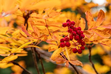 branch tree with yellow leaves with red berries of mountain ash, autumn atmosphere of forest