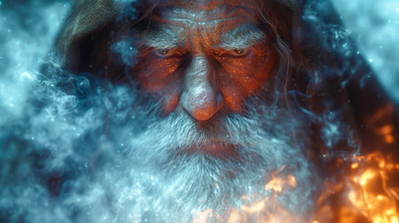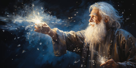 Portrait of an old man sage with a wizard beard wielding powerful magic fantasy character.