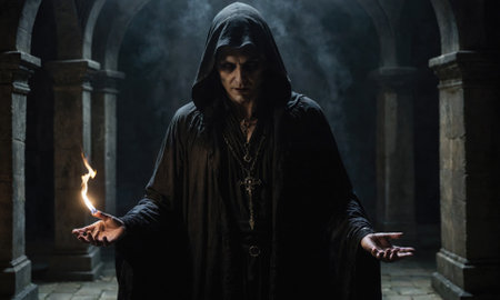 Person in a black hooded cloak, inquisitor, eerie dramatic portrait. Mysterious Inquisitor in a Black Cloak.