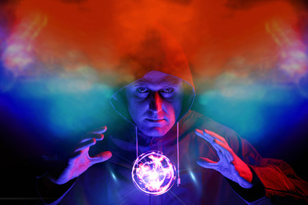 Shaman in the dark room with blue and purple lights wizard in red robe is controlling electrical globe.