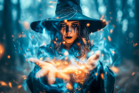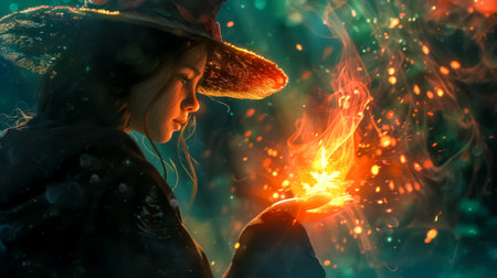 A witch with a pointed hat conjures magical flames in a dark setting, evoking a sense of mystery and enchantment on Halloween.